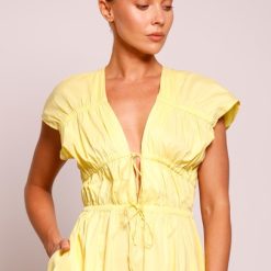 – Plunging v-neckline; adjustable tie draw-cord to bust and waist